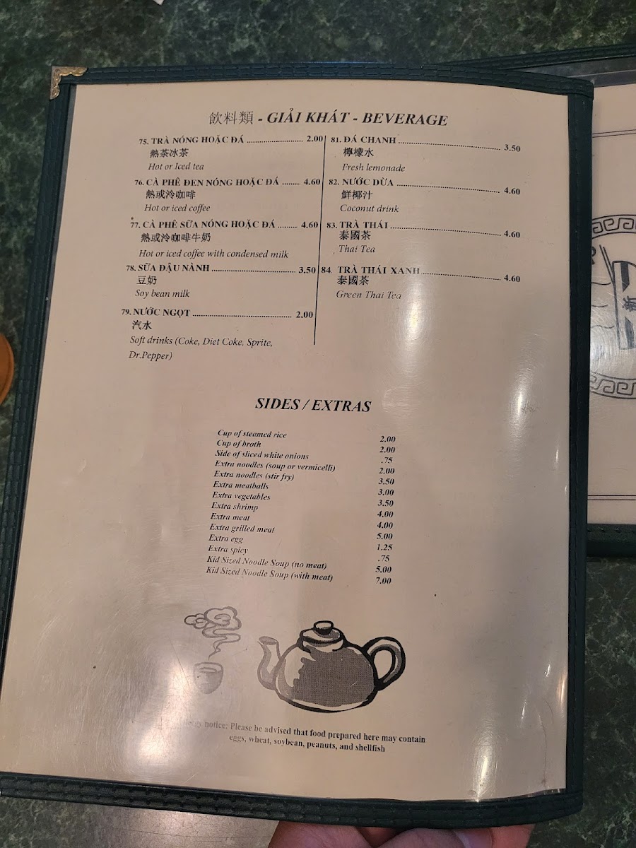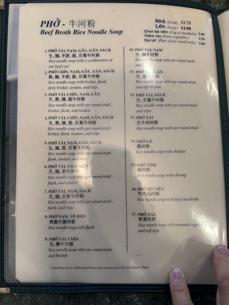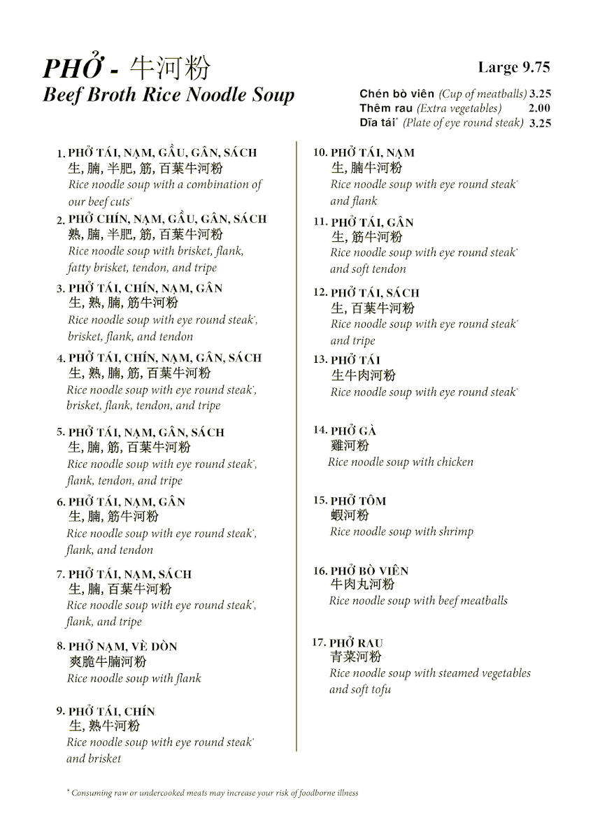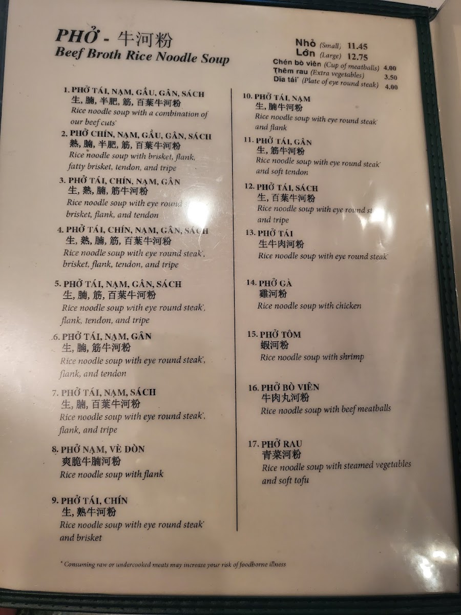 Combination pho (rare eye of round, flank, fatty brisket, tendon, tripe).
