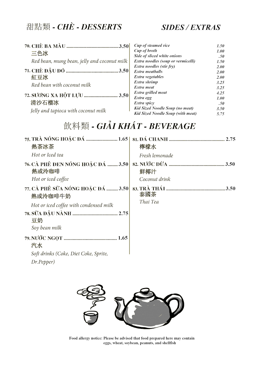 Vermicelli with your choice of grilled pork, chicken, or beef on a bed of bean sprouts and lettuce, topped with peanuts, green onions, and pickled cabbage/carrots.
