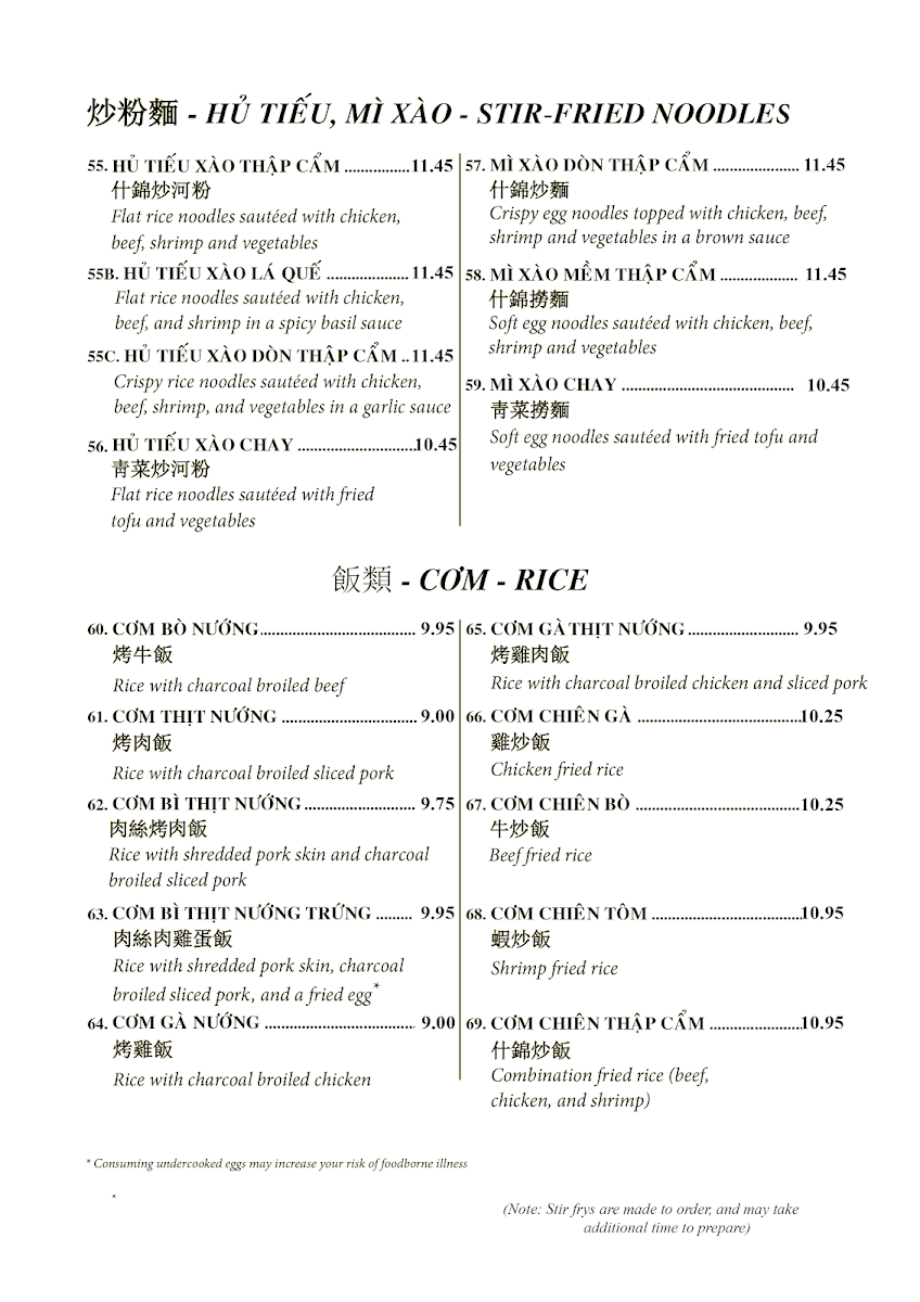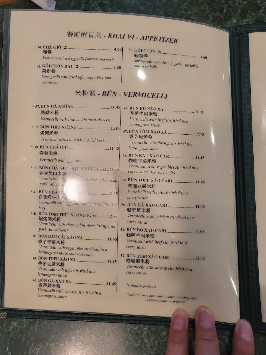 Vermicelli with egg rolls and your choice of grilled pork, chicken, or beef on a bed of bean sprouts and lettuce, topped with peanuts, green onions, and pickled cabbage/carrots.