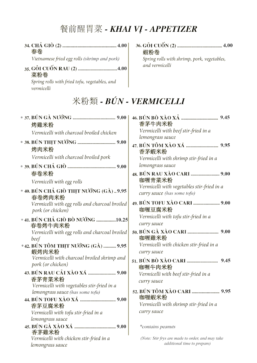 2 pieces spring rolls with fried tofu, vermicelli, lettuce, and bean sprouts served with peanut sauce.